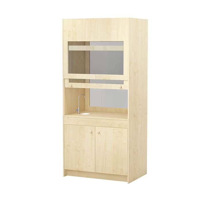 Описание. Шкаф предназначен для проведения и демонстрации опытов. Верхняя часть – с подъемной стеклянной дверью рамочной конструкции, передним остеклением и двумя глухими боковыми панелями, с роликами для тросов-противовесов стеклянной двери, с отверстием в верхней горизонтальной панели для вытяжной вентиляции диаметром 145 мм. Нижняя часть (тумба) – с двумя отделениями, с распашными дверными панелями, 2 полки. Одно отделение с двумя полками, второе – с отверстиями для подводки коммуникаций. Шкаф укомплектован электрическими розетками под напряжение 220 В и 42 В. Столешница изготовлена из ДСП с пластиковым покрытием. Толщина столешницы – 18 мм, торцы отделаны кромкой ПВХ 2 мм. Все остальные панели изготовлены из ЛДСП 16 мм. В комплектацию входят водоразборная колонка и полипропиленовая раковина. Материал—ЛДСП/ПЛАСТИК