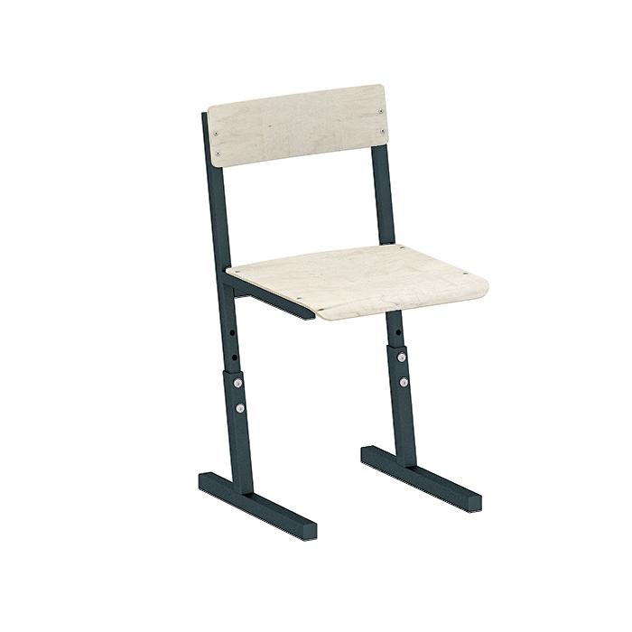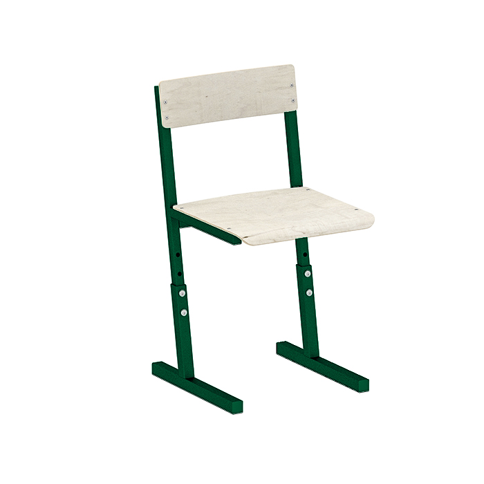 Стул регулируемый по высоте 3-5 группы роста. Сиденье и спинка изготовлены из гнутоклееной фанеры, покрыты бесцветным лаком, крепятся к металлическому каркасу при помощи заклепок.