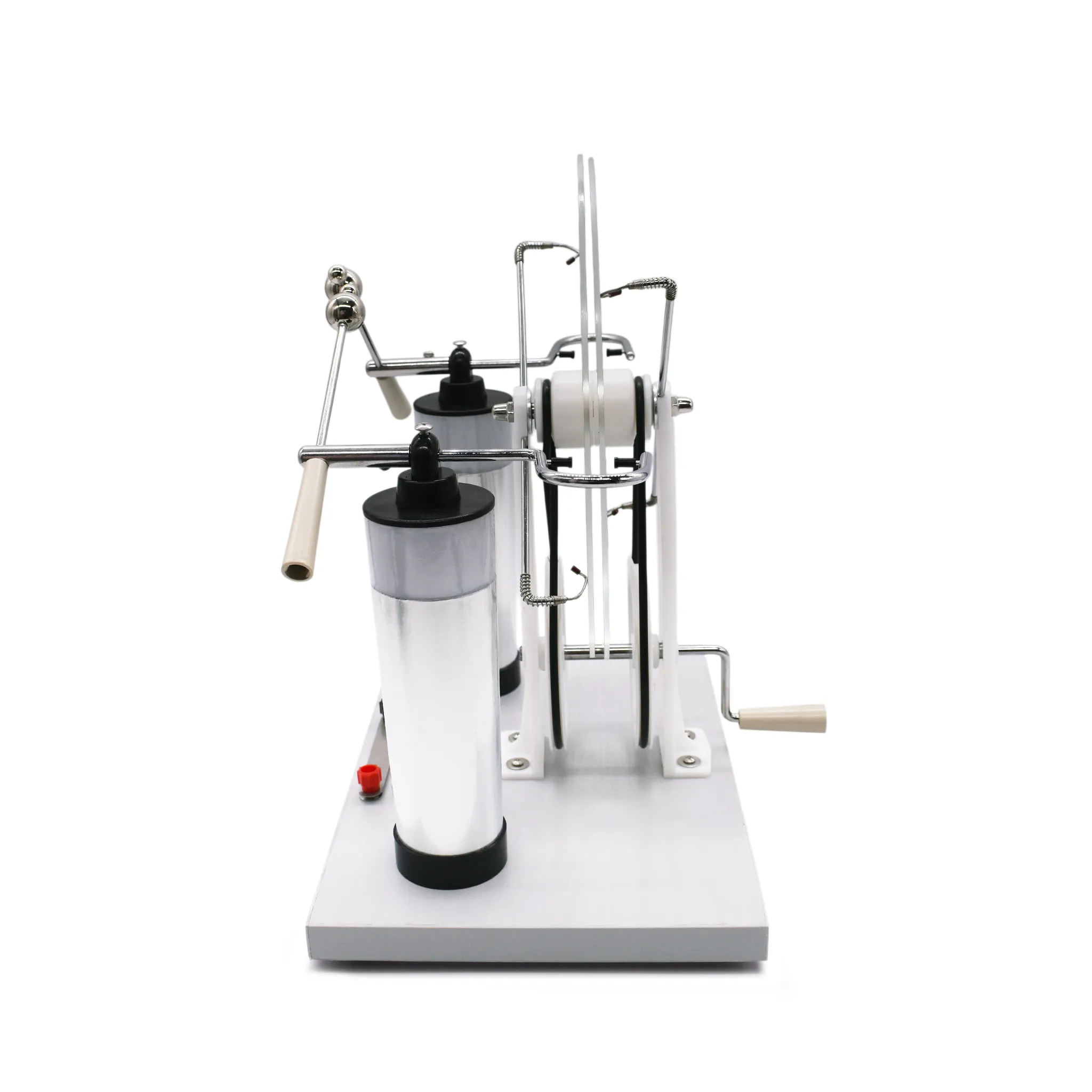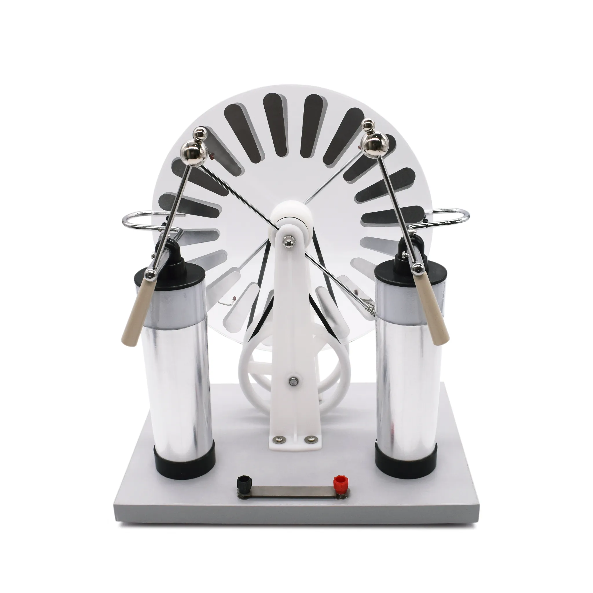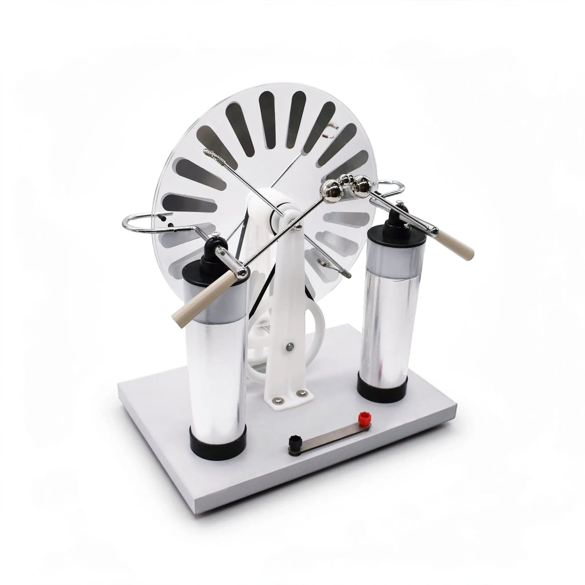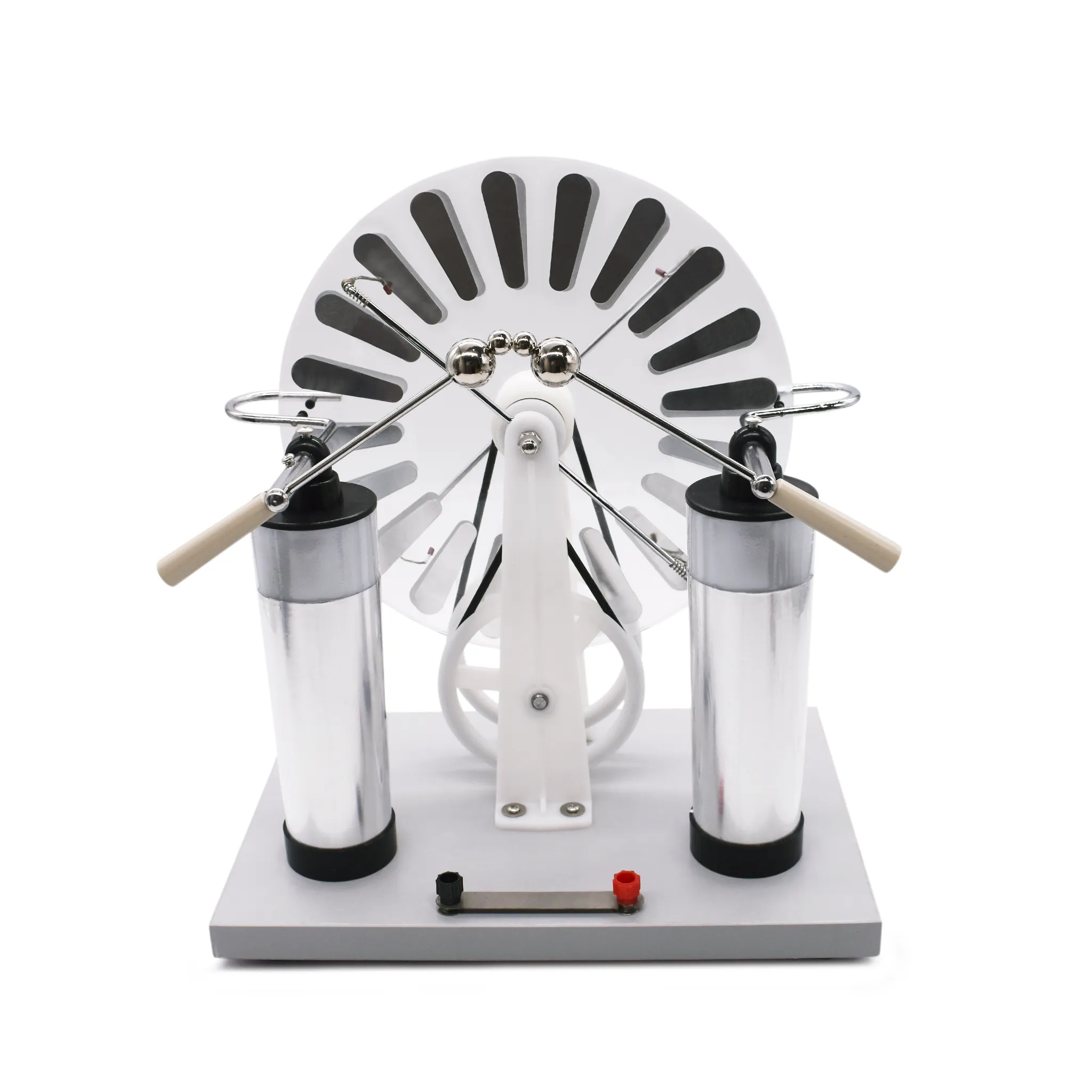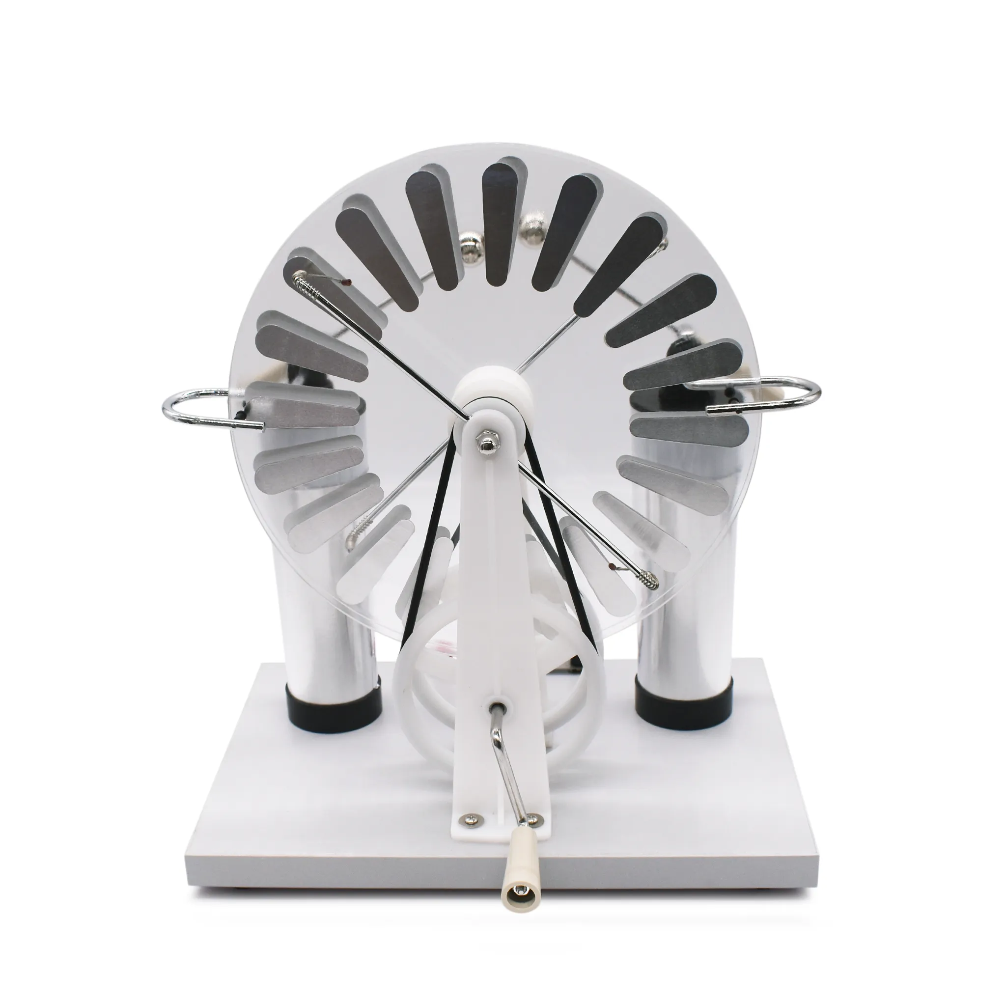 Электрофорная машина — это электростатический генератор, предназначенный для генерирования высокого постоянного напряжения. Прибор используется для демонстрации принципов электростатической индукции, накопления электрических зарядов на полюсах (например, на лейденских банках). Работа машины позволяет визуализировать абстрактные понятия электродинамики, генерировать искровые разряды и накапливать значительный электрический заряд.Работа прибора основана на принципе электростатической индукции. Благодаря механизму (центральная ось и приводные элементы), который обеспечивает встречное вращение дисков с равной угловой скоростью, на полюсах создается разность потенциалов. Прозрачная круглая часть дисков с нанесёнными проводящими секторами позволяет учащимся детально наблюдать за механикой процесса.