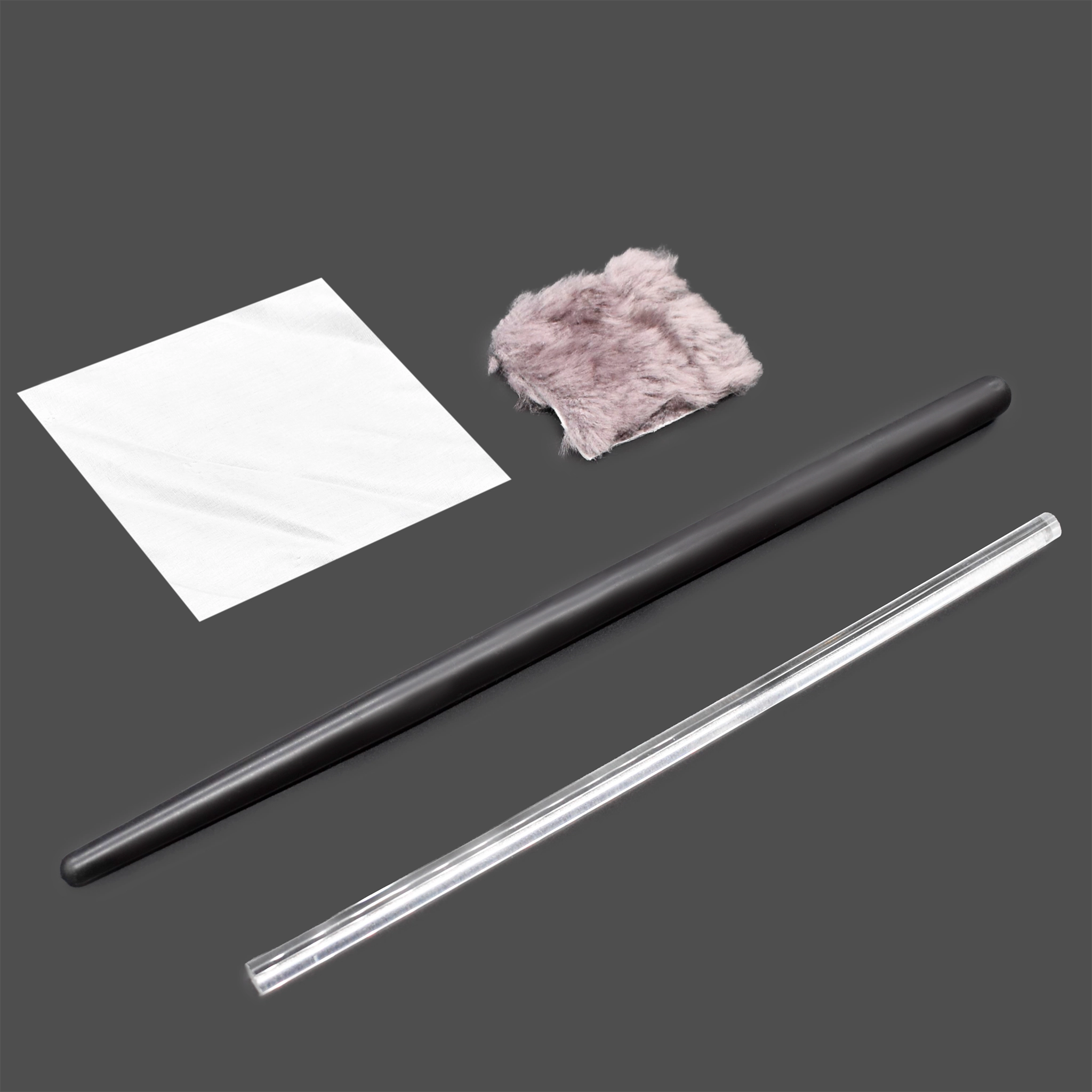 Набор предназначен для электризации тел и получения положительных и отрицательных зарядов при проведении демонстрационных опытов по электростатике. Для получения положительного заряда стеклянную палочку натирают лоскутом шёлка, а отрицательного — эбонитовую палочку лоскутом шерсти. Палочки следует брать за конец, не захватывая руками всю поверхность.