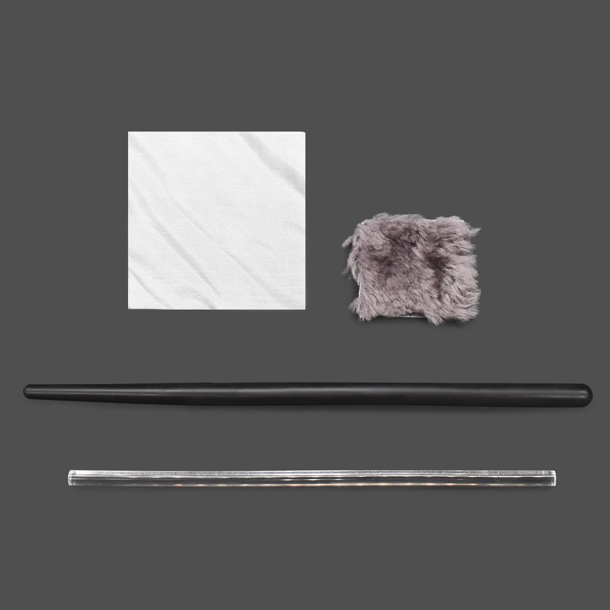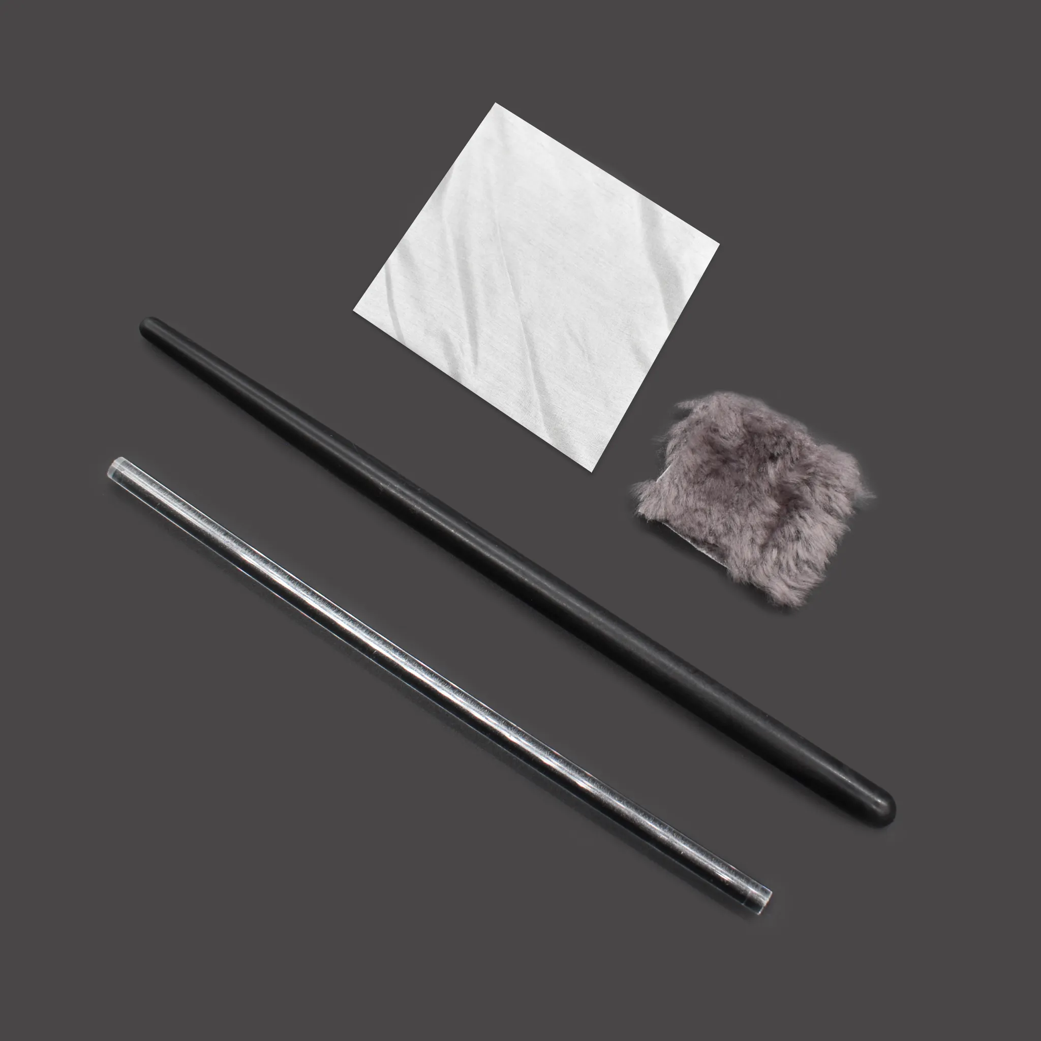 Специализированный учебно-лабораторный комплект предназначен для проведения классических экспериментов по разделу «Электродинамика» в общеобразовательных школах, лицеях и центрах технического творчества. Набор является фундаментальным инструментом для изучения природы электрического заряда и наглядной иллюстрации трибоэлектрического эффекта (электризации тел при трении).Пособие позволяет педагогу наглядно продемонстрировать получение зарядов обоих знаков: положительного — путём взаимодействия стеклянной палочки с шелковой тканью, и отрицательного — при трении эбонитовой палочки о лоскут меха. Комплект незаменим при изучении основ закона Кулона, принципов работы электроскопов и механизмов взаимодействия заряженных тел.
