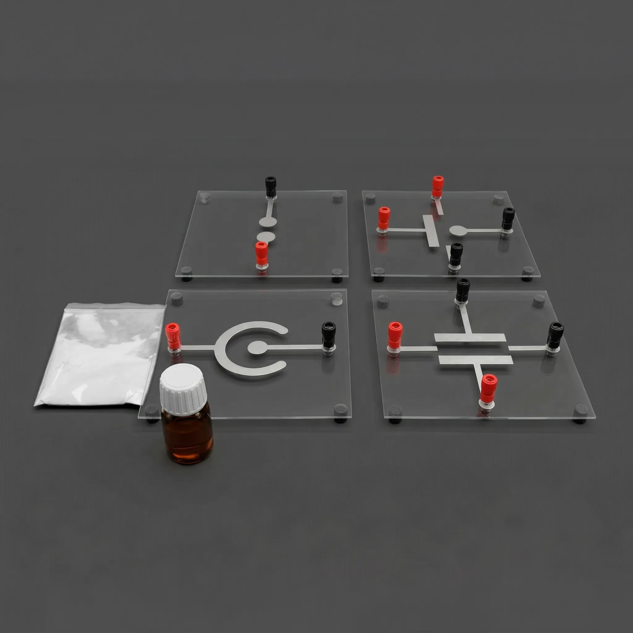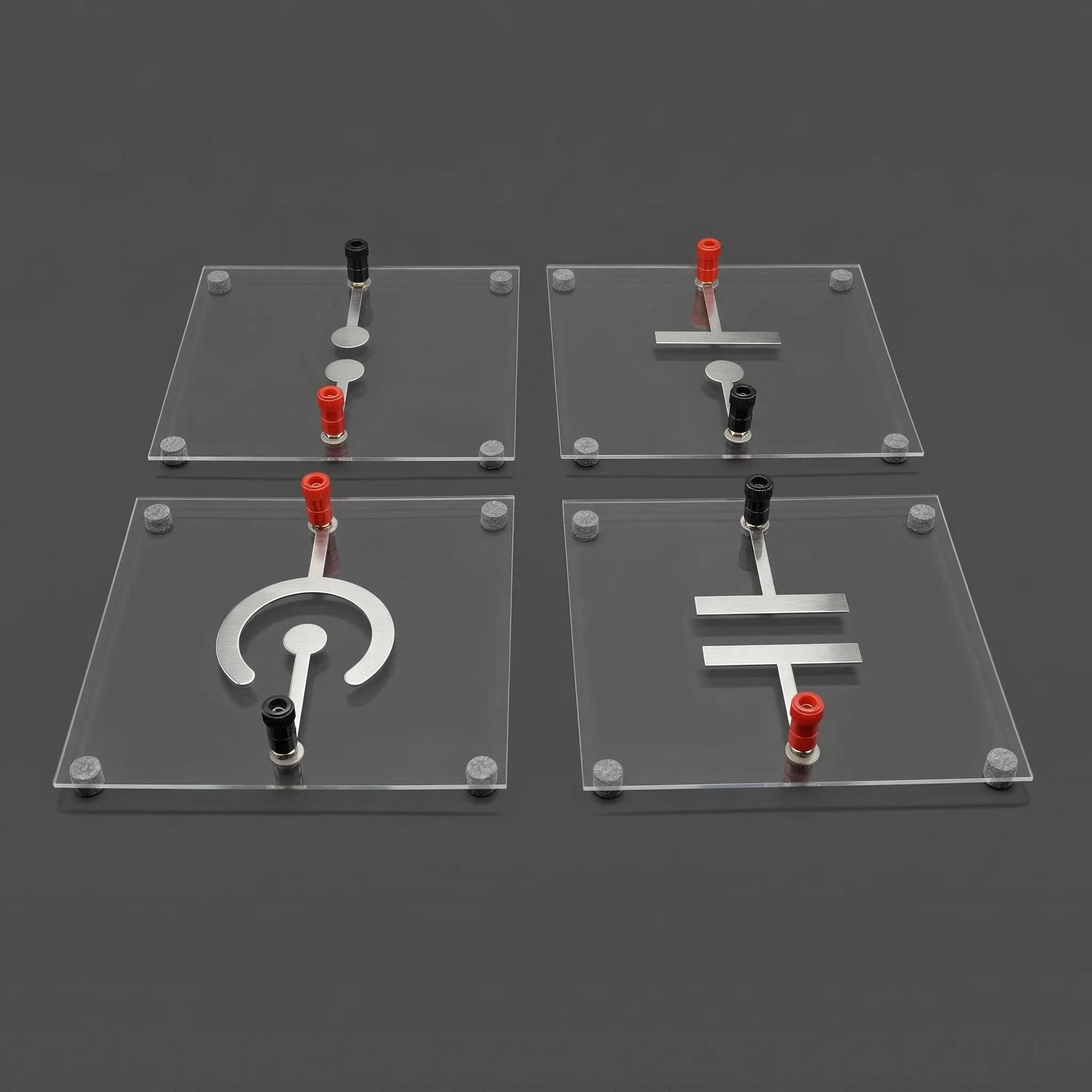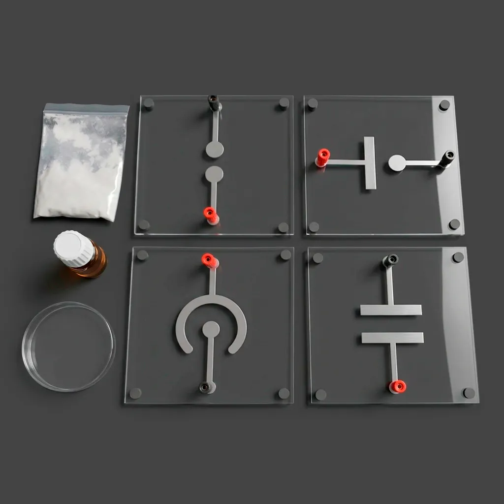 - Разнообразие конфигураций: Набор включает в себя четыре типа пластин с электродами, что позволяет моделировать различные физические ситуации: от поля диполя до поля внутри и снаружи конденсаторов.