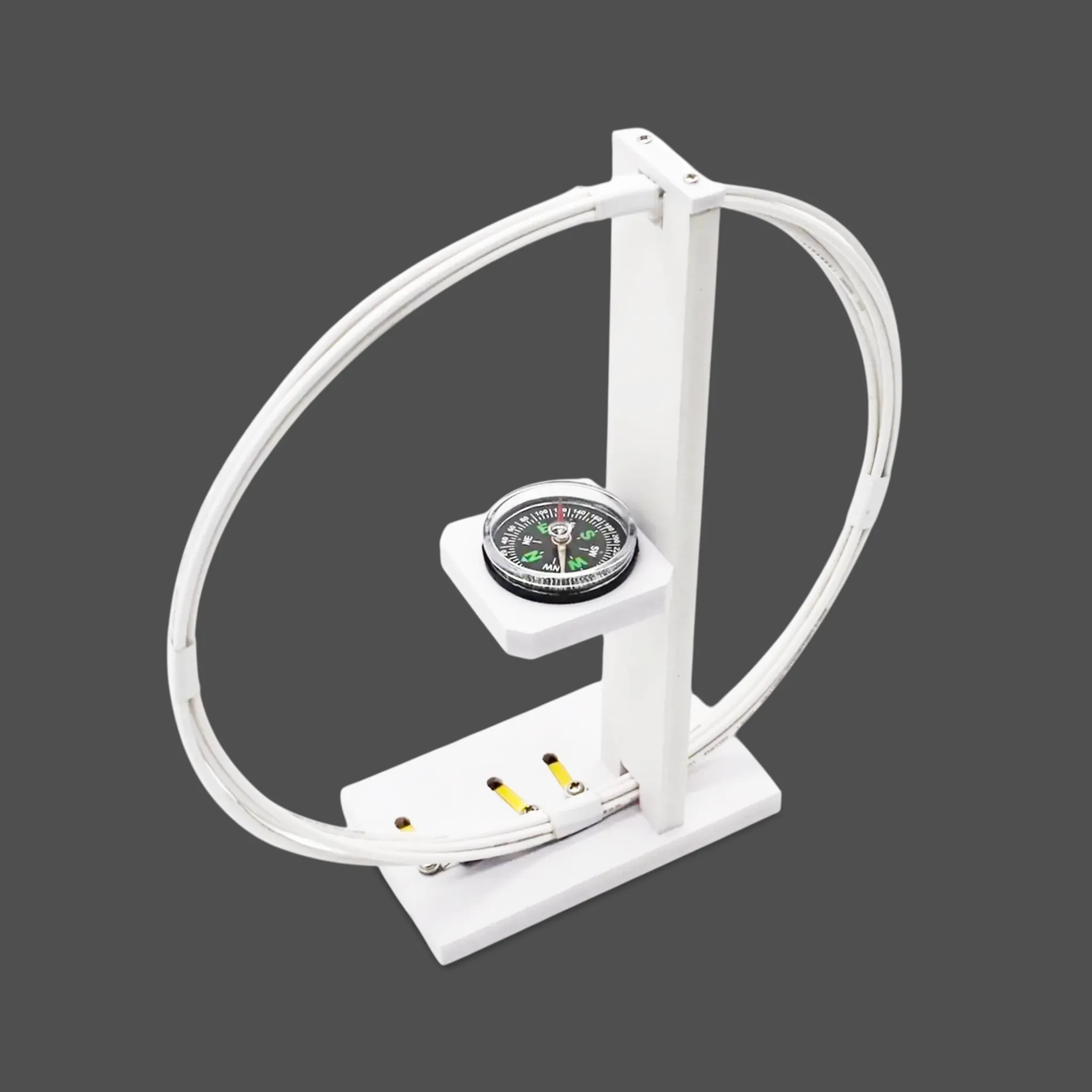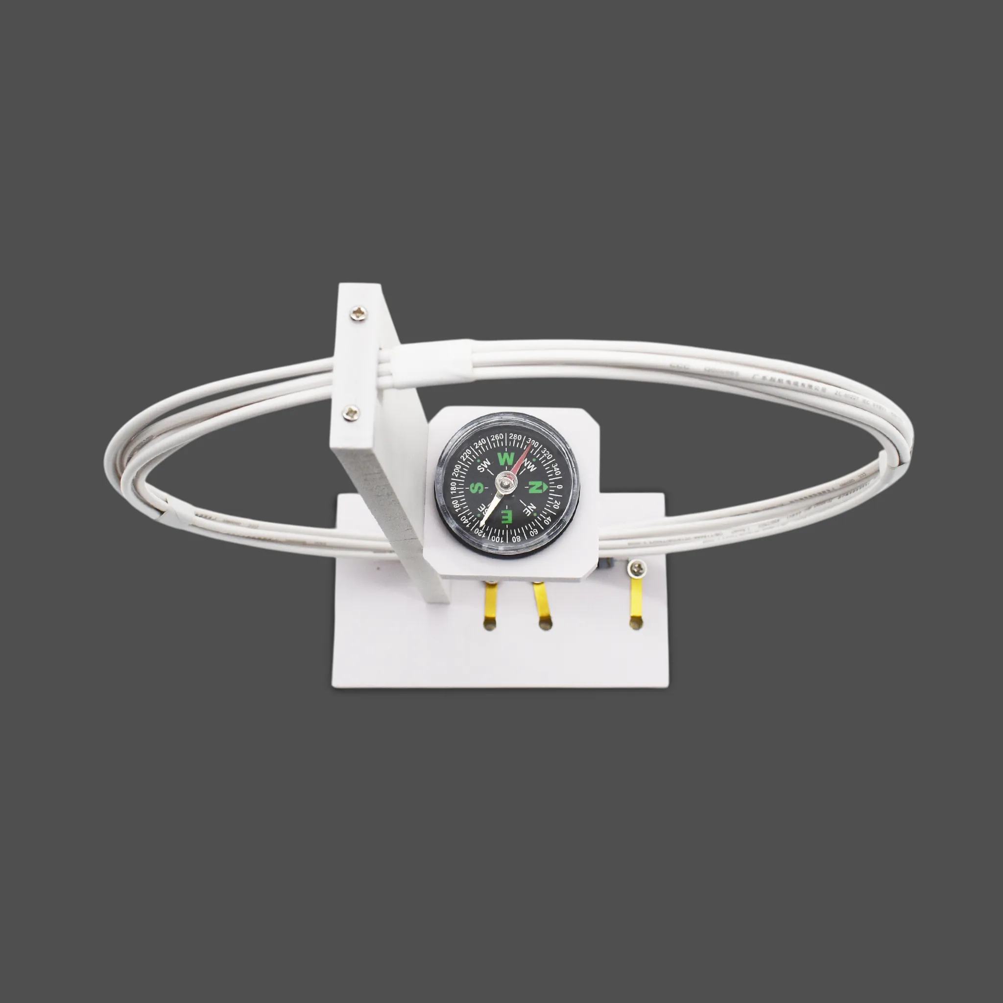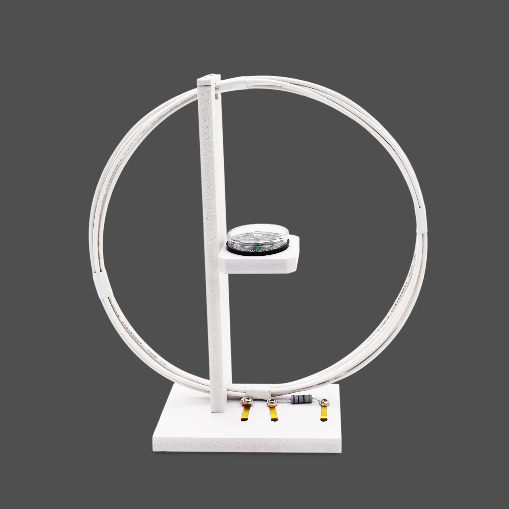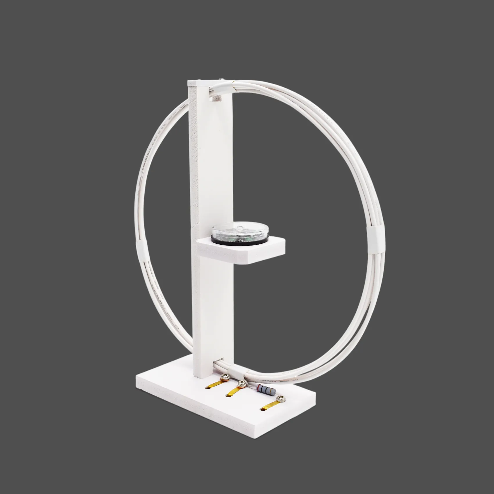1. Катушка - 6 витков одножильного алюминиевого провода с пластиковой изоляцией. Закреплена на основании с контактными гнёздами. В центре на стойке расположена площадка для компаса.