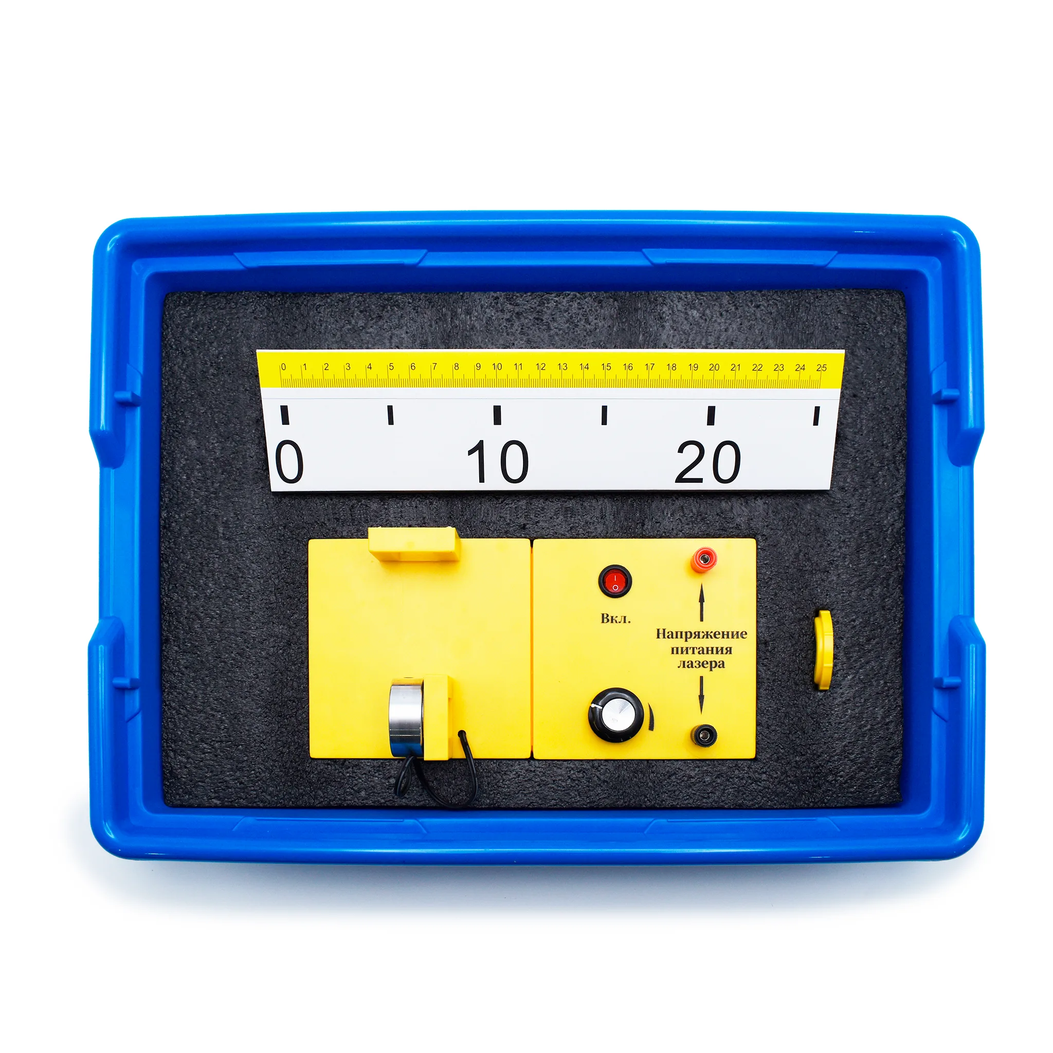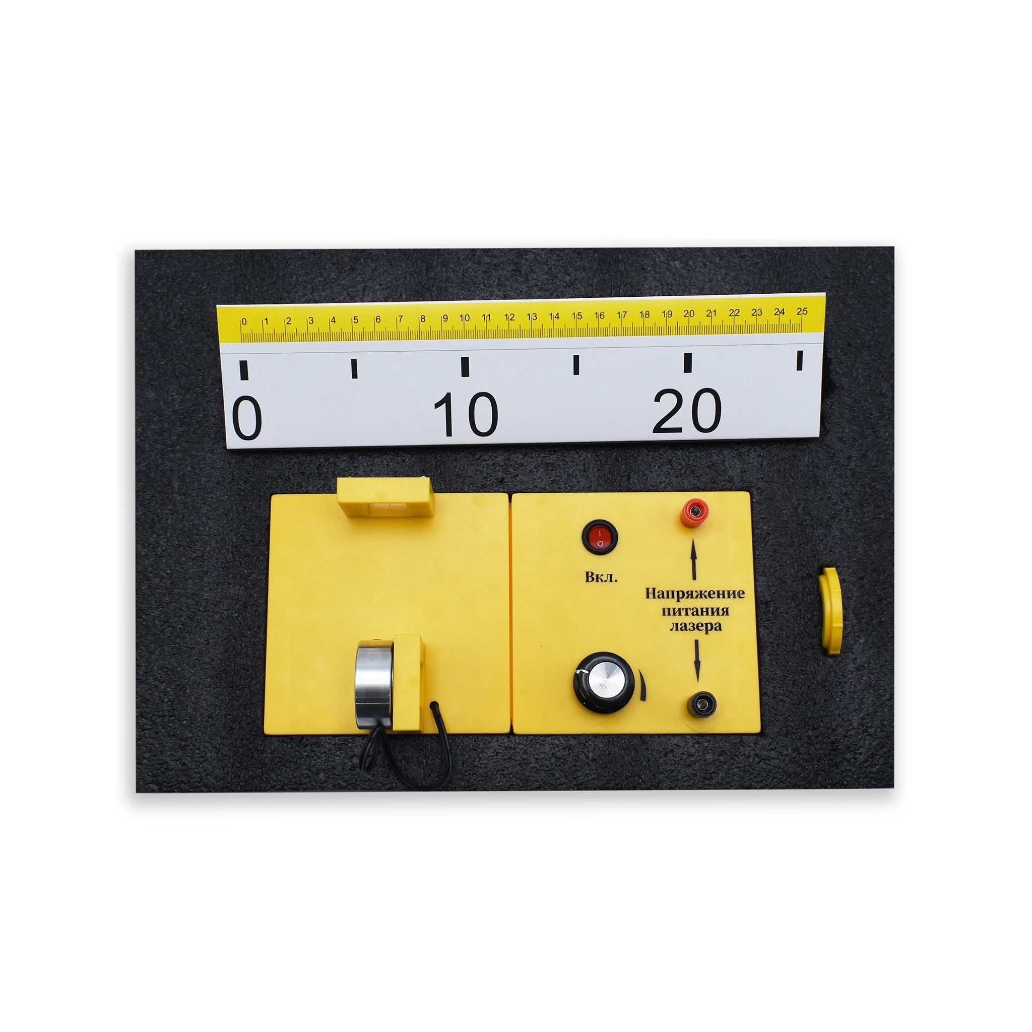 3. Электрическая цепь с регулировкой напряжения (на платформе): кнопка включения («Вкл.»), регулятор напряжения питания лазера (поворотная ручка), разъём для измерения напряжения.