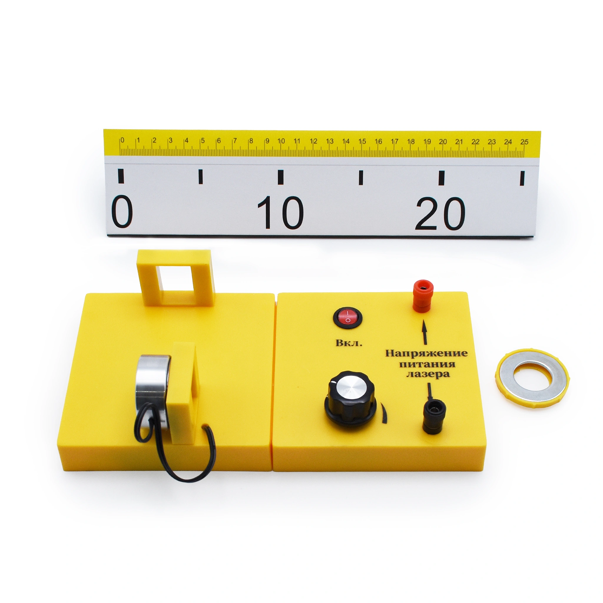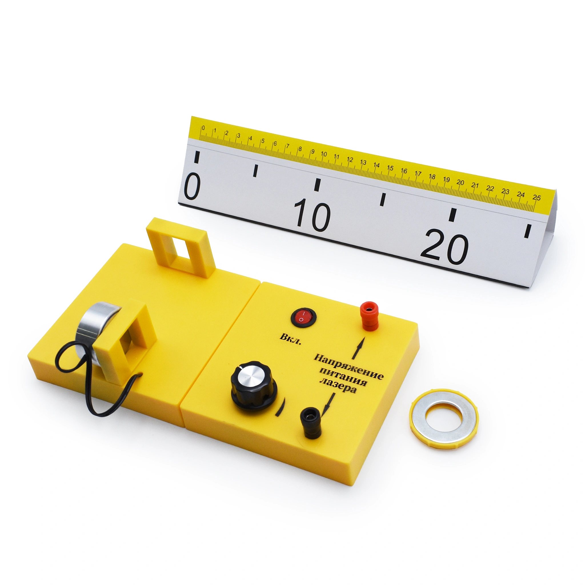 2. Полупроводниковый лазер — источник монохроматического света, напряжение питания которого можно регулировать. Конструкция лазера сложена в металлическую круглую оправу, диаметр: 38 мм, толщина: 15 мм. Крепится магнитной стороной к платформе.