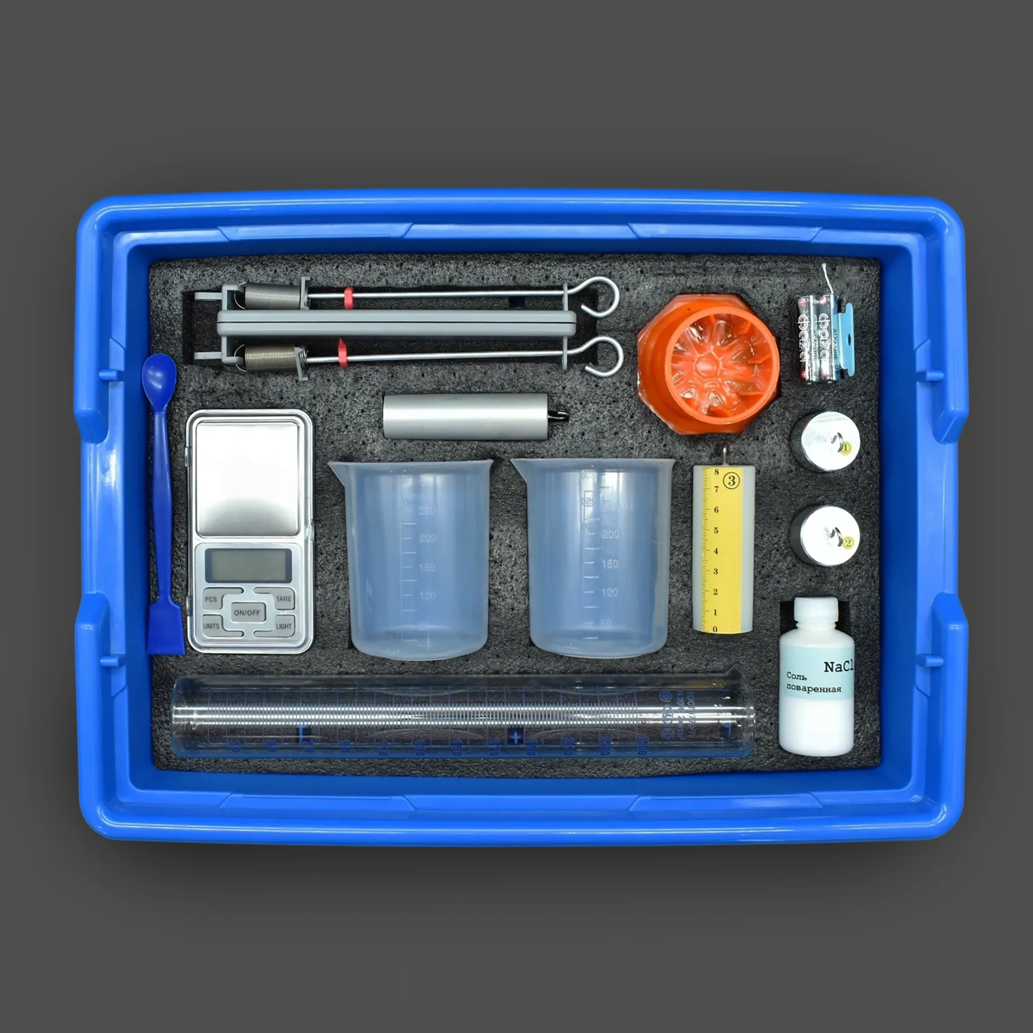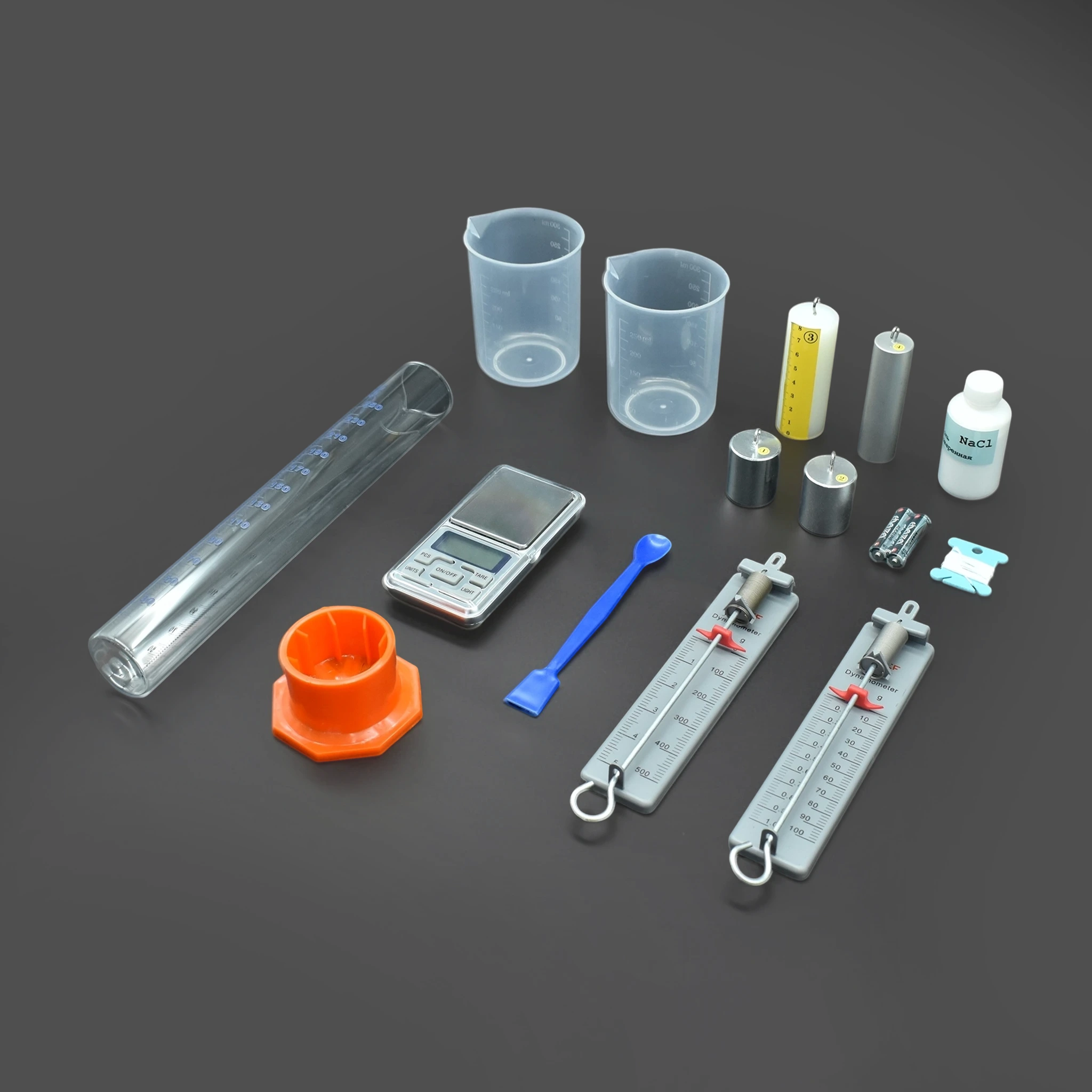 Комплект предназначен для выполнения экспериментальных заданий ОГЭ по физике в соответствии со Спецификацией контрольных измерительных материалов, утверждённой ФГБНУ «ФИПИ». С его помощью можно измерить среднюю плотность вещества, исследовать архимедову силу и её зависимость от объёма погружённой части тела и плотности жидкости, а также подтвердить независимость выталкивающей силы от массы тела.