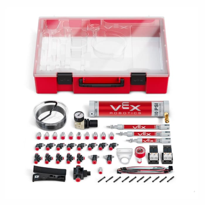 Содержит всё необходимое для работы с пневматикой на уроках или в условиях соревнований по робототехнике VEX. Пневматика обеспечивает быстрое и мощное линейное движение, которое полезно в самых разных инженерных системах. Пневматическую систему можно использовать для управления захватом робота или любого другого механизма, требующего быстрое движение. В частности, пневматика полезна в приложениях, имеющих только два состояния (открыто/закрыто, вверх/вниз и т. д.).