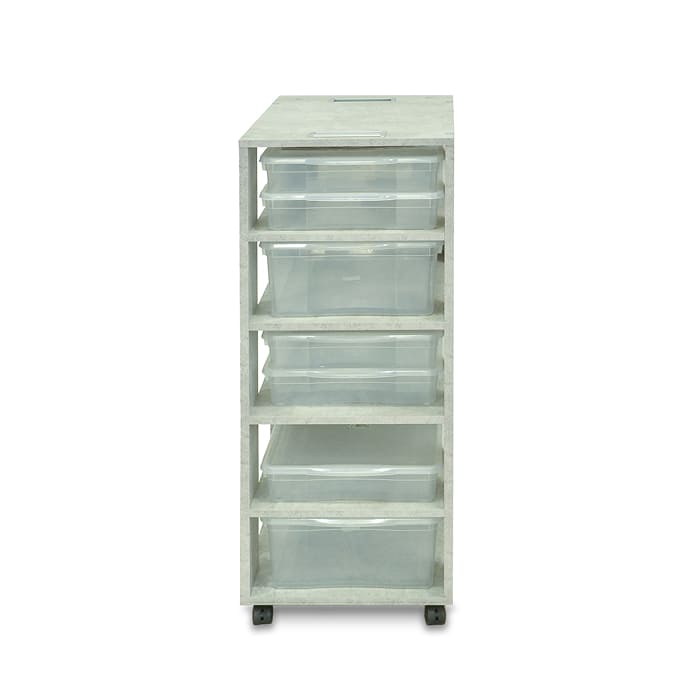 У стойки пять вместительных полок прямоугольной формы с нишами для хранения лотков. Сверху - полка со сплошной поверхностью. Для удобства перемещения стойка оснащена 2-мя встроенными ручками на верхней поверхности и 4-мя колесиками.