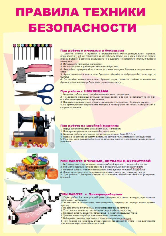 Учебно-наглядное пособие разработано для комплексного оснащения кабинетов технологии в общеобразовательных школах. Комплект предназначен для обучения учащихся правилам охраны труда, методам профилактики травматизма и основам безопасного ведения домашнего хозяйства.Визуализация правил безопасной работы в зонах кулинарии и швейного дела является обязательным условием организации учебного процесса. Набор помогает сформировать у школьников культуру безопасности при обращении с электроприборами, режущими инструментами и кухонным инвентарем, обеспечивая соблюдение нормативных требований по охране труда в учебных заведениях.